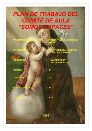El documento presenta el plan de trabajo del comité del aula "Somos Capaces" de la Institución Educativa No 22626 "San Antonio de Padua" para el grado 2° sección B. El plan describe los objetivos, comisiones y actividades a realizar para mejorar la producción de textos de los estudiantes. El objetivo general es que el 60% obtenga la calificación A, a través de 3 objetivos específicos y 3 comisiones de trabajo que implementarán diferentes actividades hasta noviembre.