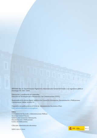 Este documento presenta el Plan de Transformación Digital de la Administración General del Estado y sus organismos públicos para el período 2015-2020. El plan establece cinco objetivos estratégicos para impulsar la transformación digital, incluyendo incrementar la productividad interna, profundizar la transformación digital para que el canal digital sea preferente, y fomentar la innovación y el emprendimiento a través de las TIC. El plan también define principios rectores como la orientación al usuario y la colaboración interadministrativa, y propone líneas de acción y hitos