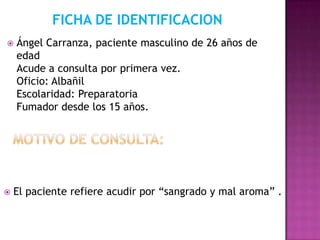 El documento presenta el caso de un paciente de 26 años que acude a consulta por sangrado y mal olor en la boca. Tras la exploración, se diagnostica una periodontitis agresiva localizada. El tratamiento propuesto consiste en 5 citas que incluyen profilaxis dental, curetaje cerrado y farmacoterapia para aliviar la inflamación y promover la cicatrización. El objetivo es mejorar la salud periodontal del paciente a través de la eliminación de placa y tártaro con su cooperación.