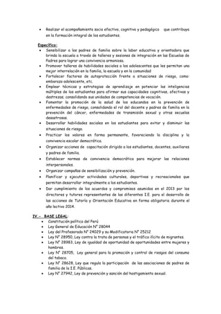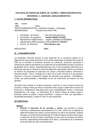 Este plan anual de trabajo del comité de tutoría y orientación educativa describe los objetivos y actividades planeadas para el año lectivo 2014. El plan busca promover el desarrollo integral de los estudiantes a través de talleres sobre habilidades sociales, valores, salud, y prevención de problemas como el embarazo adolescente. Además, se enfocará en mejorar la convivencia escolar y disciplina mediante normas democráticas y campañas de sensibilización.