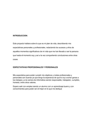 Este documento presenta el plan de vida de Jovany Mizael Mejia Mercado, estudiante de Conalep Tlaquepaque. Describe sus expectativas profesionales de terminar su carrera en informática y conseguir empleo, así como objetivos personales como controlar su enojo y ahorrar para comprar un auto. Incluye una línea de tiempo de su vida, una matriz FODA, prioridades y objetivos a corto, mediano y largo plazo. Concluye que este plan le permite organizar sus metas y mejorarse cada día tanto profesional