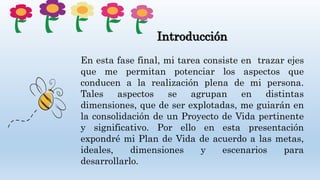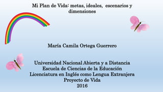 Este documento presenta el plan de vida de María Camila Ortega Guerrero, el cual incluye metas y dimensiones como la académica, profesional, física y espiritual. En la dimensión académica, su meta es graduarse de la licenciatura en inglés para 2021. En la profesional, su meta es cursar una maestría en didáctica del inglés para 2024. En la física, su meta es mantener hábitos saludables para mejorar su energía y autoconfianza. Finalmente, en la dimensión espirit