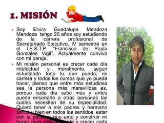 El documento presenta el proyecto de vida de Guadalupe Mendoza, una estudiante de 20 años de Secretariado Ejecutivo. Su misión es seguir estudiando e intelectual y moralmente. A corto plazo, quiere aprobar sus cursos y realizar prácticas. A mediano plazo, obtener su título y estudiar para profesora. A largo plazo, trabajar como secretaria en una empresa importante.