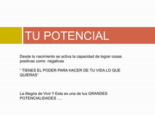 Este documento presenta un plan de vida y carrera que cubre diferentes aspectos de la vida de una persona como el espiritual, intelectual, afectivo, familiar, recreativo, social, corporal, ocupacional y económico. El plan incluye secciones sobre el potencial de una persona, la autoestima, el conocimiento propio, metas prioritarias y una visión y misión personal. El objetivo general es ayudar a las personas a desarrollar un plan integral para lograr el éxito en la vida.