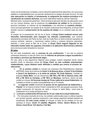 El Grupo Clarín presentó un plan de adecuación voluntaria a la ley de medios ante la justicia y la AFSCA, dividiendo su estructura en seis unidades empresariales independientes. Lo hizo ante el avance ilegal del gobierno para quitarle sus licencias de manera compulsiva, pese a que según la Corte Suprema debe tener los mismos plazos que otros grupos. El Grupo Clarín mantiene su compromiso con el periodismo independiente y seguirá litigando para defender sus derechos.