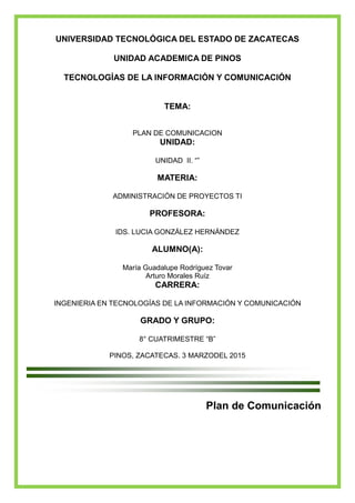 Este documento presenta un plan de comunicación para un proyecto de desarrollo de software. El plan describe 10 acciones de comunicación clave, como informar el inicio del proyecto, tomar decisiones técnicas y de personal, informar sobre el rendimiento y los costos, y presentar el proyecto final. El plan también incluye una planificación con fechas para cada acción de comunicación.