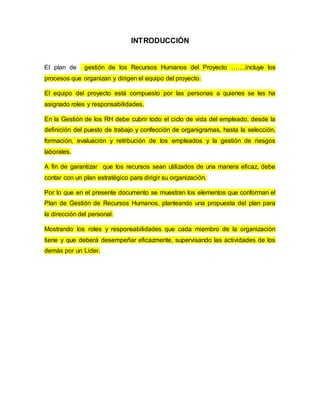 Este documento presenta el plan de gestión de recursos humanos para un proyecto de lámparas controladas por comandos de voz. Incluye un catálogo de roles y responsabilidades, un organigrama del proyecto, planes para la adquisición, capacitación, evaluación y liberación del personal, así como reconocimientos y recompensas. El objetivo es dirigir los esfuerzos del equipo para desarrollar su potencial de forma estratégica, ética y social.