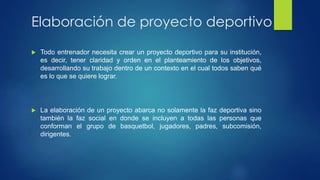 El documento describe los pasos para elaborar un plan deportivo efectivo, incluyendo analizar los recursos disponibles, establecer objetivos realistas y asegurar que todos los involucrados (jugadores, padres, entrenadores) comprendan la visión y el plan. Un buen plan considera no solo los aspectos deportivos sino también los sociales, e integra a toda la comunidad en el proceso de manera organizada y jerárquica para lograr un desarrollo progresivo.