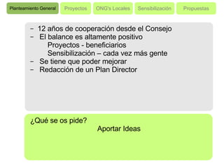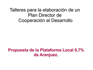 El documento propone la elaboración de un Plan Director de Cooperación al Desarrollo para la ciudad de Aranjuez. Se discuten varias cuestiones como mejorar el impacto de los proyectos financiados, aumentar la sensibilización de los ciudadanos, y fortalecer las ONG locales. Se pide aportar ideas sobre estos temas. Actualmente hay nueve grupos trabajando en proyectos de cooperación en sectores como educación e infancia.