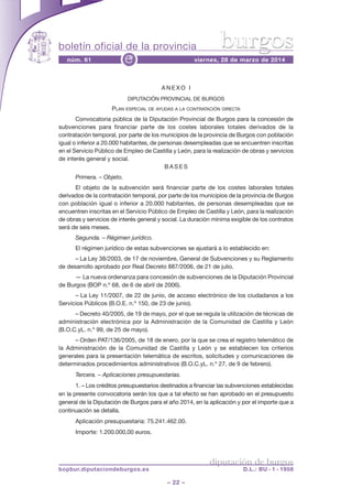 El Boletín Oficial de la Provincia de Burgos presenta la aprobación del Plan de Empleo 2014, cuyo objetivo es fomentar el empleo y dinamizar las economías locales mediante la asignación de 1.500.000 euros a diversas líneas de actuación. Se establecen subvenciones para la contratación de trabajadores desempleados por municipios de menos de 20,000 habitantes, así como ayudas para el emprendimiento, el fomento del tejido empresarial y planes de formación. Los municipios interesados deben cumplir con ciertos criterios y presentar solicitudes dentro del plazo establecido.