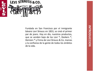 El documento presenta el plan estratégico de Levi's para posicionar su marca de jeans en el mercado nacional. Los objetivos son posicionar la marca en el 80% del mercado nacional para satisfacer las necesidades de los clientes con precios accesibles, y vender el 40% de sus jeans a dos segmentos de mercado: jóvenes de 10 a 15 años y mujeres adultas con varices. Las estrategias incluyen monitorear la calidad, satisfacción de clientes, diseñar nuevos modelos, realizar eventos promocionales y publicidad para cumpl