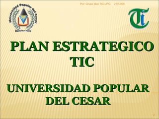 El documento presenta el Plan Estratégico de Tecnologías de la Información y Comunicación (TIC) 2009-2012 de la Universidad Popular del Cesar. El plan tiene como visión que para 2012 la universidad sea reconocida por su liderazgo en procesos de enseñanza a través de programas académicos de calidad y pertinencia apoyados por las TIC. El plan propone objetivos como disponer de una comunidad que use efectivamente las TIC, tener un modelo educativo integrado con las TIC, y contar con infraestructura y alianzas
