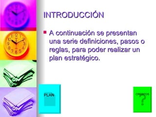Este documento presenta una guía sobre cómo crear un plan estratégico efectivo, incluyendo definiciones clave, pasos a seguir y consideraciones importantes. Explica que un plan estratégico es una herramienta para alcanzar objetivos determinados mediante el establecimiento de estrategias, tácticas y controles. Detalla las 7 etapas clave para desarrollar un plan estratégico exitoso: análisis de situación, pronóstico, objetivos, estrategia, tácticas, controles y retroalimentación.