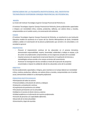 Este documento presenta un plan estratégico para el Instituto Tecnológico Superior Consejo Provincial de Pichincha durante su transición a una nueva estructura legal. Incluye un análisis interno y externo usando una matriz FODA, y establece cuatro objetivos estratégicos: 1) mejorar la calidad de la docencia, 2) modernizar la gestión, 3) posicionarse a nivel regional, nacional e internacional, y 4) fortalecerse institucionalmente. Propone estrategias y objetivos de gestión detall