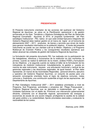 Este documento presenta el Plan Estratégico Institucional 2007-2011 del Gobierno Regional de Apurímac. El plan tiene como objetivo promover una intervención gubernamental eficiente y coherente con el desarrollo regional a través de la implementación de cinco programas estratégicos: Uso racional de recursos naturales, salud, nutrición y educación, sistemas de riego y producción, infraestructura para el desarrollo, y participación ciudadana. El plan fue formulado con la participación de funcionarios a través de talleres y estable