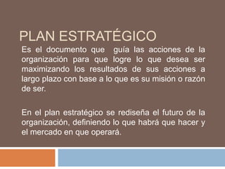 El documento presenta una guía para el desarrollo de un plan estratégico. Explica que un plan estratégico define la misión, visión, objetivos y estrategias de una organización para lograr sus metas a largo plazo. Incluye formatos para registrar la información clave como la misión, análisis interno y externo, estrategias, programa de actividades y presupuesto.