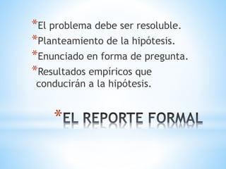Este documento presenta los pasos para realizar un experimento científico, incluyendo la formulación de una hipótesis y variables, el diseño y procedimiento experimental, el análisis estadístico de datos, y la estructuración de un informe formal. También describe métodos no experimentales como la observación clínica y de campo, y destaca la importancia de controlar variables extrañas y objetivar el problema y la hipótesis planteada.