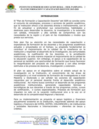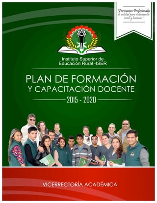 El plan de formación y capacitación docente del Instituto Superior de Educación Rural de Pamplona para el período 2015-2020 tiene como objetivo establecer las áreas clave de formación y actualización para los docentes con el fin de mejorar la calidad de la enseñanza. El plan identifica seis líneas de formación que incluyen pedagogía, tecnología educativa, acreditación, investigación, actualización disciplinar y atención a la diversidad. El diagnóstico muestra que la mitad de los docentes tienen maestría y el 41% rest