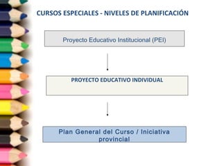 Este documento presenta las orientaciones para el Plan General de Curso Especial. Describe los niveles de planificación educativa, incluyendo el Proyecto Educativo Institucional, el Plan General del Curso y la planificación de la educadora. Además, detalla los contenidos y líneas de acción a seguir durante los períodos de diagnóstico, ejecución y evaluación, con énfasis en los niños y niñas, la familia, la planificación, la evaluación y otros aspectos.