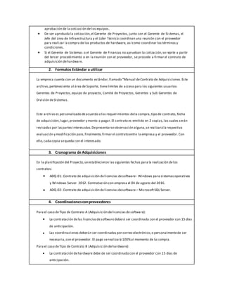 El documento presenta el plan de gestión de las adquisiciones para un proyecto de un sistema integral para una clínica oftalmológica. Describe dos tipos de contratos para la adquisición de software y hardware, incluyendo los procesos, formatos, cronogramas, coordinaciones con proveedores, riesgos y métricas. El objetivo es estandarizar los procesos de compra para asegurar la obtención oportuna de los recursos necesarios para el proyecto.