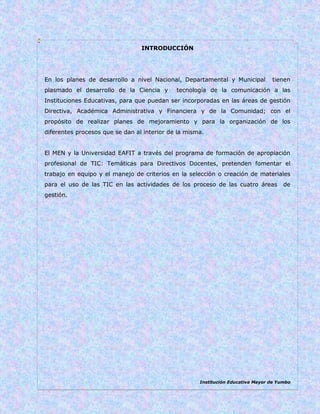 El documento presenta el plan de gestión en TIC de la Institución Educativa Mayor de Yumbo para el periodo 2010-2019. El plan busca utilizar las tecnologías de la información y comunicación para apoyar las áreas de gestión directiva, académica, administrativa, financiera y de la comunidad educativa. Se realiza un diagnóstico de debilidades, oportunidades, fortalezas y amenazas en cada área y se proponen objetivos, líneas estratégicas, programas y proyectos para mejorar el uso de las TIC en