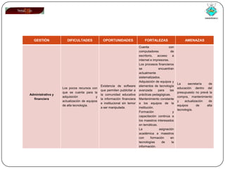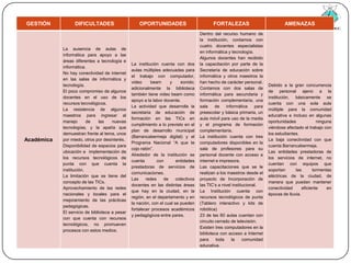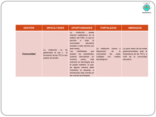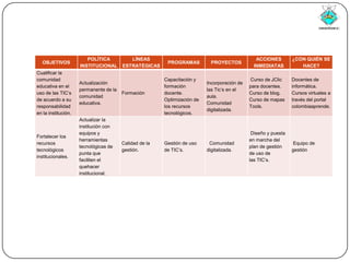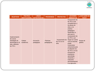 El documento presenta el plan de gestión de uso de las TIC de la Escuela Normal Superior Cristo Rey para 2010-2015. La escuela busca promover el uso constante de las TIC en la gestión directiva, académica y administrativa. Las metas incluyen dotar de infraestructura tecnológica, capacitar al personal y utilizar equipos de alta tecnología para mejorar el aprendizaje de los estudiantes. Los indicadores miden el progreso en capacitación del personal, conectividad y uso de las TIC en la enseñanza.