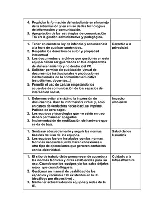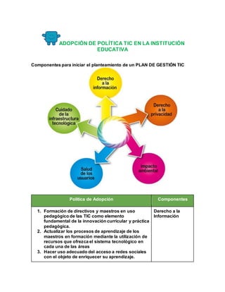 Este documento presenta los componentes clave para iniciar el planteamiento de una política de adopción de tecnologías de la información y comunicación (TIC) en una institución educativa. Propone cinco componentes principales: 1) Formación de directivos y maestros en el uso pedagógico de las TIC, 2) Actualización de procesos de aprendizaje de maestros mediante recursos TIC, 3) Uso adecuado de redes sociales para enriquecer el aprendizaje, 4) Formación de estudiantes en el manejo de inform