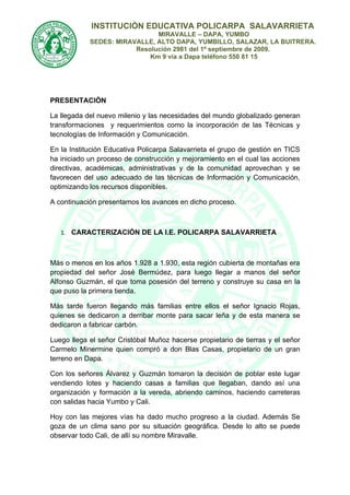 Este documento presenta el plan de gestión de uso de las TIC's en la Institución Educativa Policarpa Salavarrieta. La institución tiene 5 sedes en Dapa, Yumbo y atiende a 570 estudiantes. Actualmente sus principales debilidades son la falta de conectividad permanente a internet y la insuficiencia de equipos. Sin embargo, los docentes poseen conocimientos básicos de TIC's y el modelo pedagógico incorpora su uso. El plan busca mejorar el acceso a las tecnologías aprovechando programas nacionales de