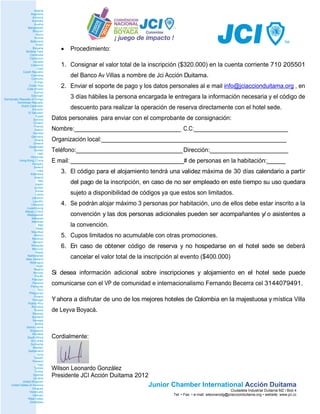 Este documento detalla las condiciones comerciales para el plan hotel sede de la convención JCI Colombia 2012, incluyendo los valores de inscripción, alojamiento por persona, procedimientos de pago, requisitos de reserva, y servicios incluidos/excluidos.