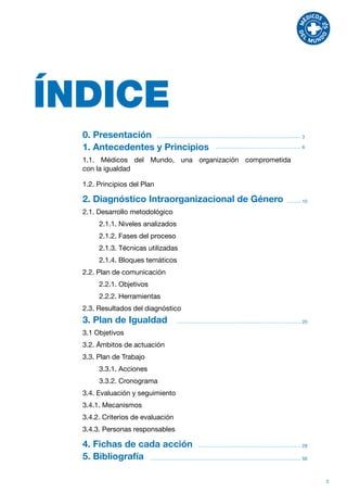 El documento presenta el Plan de Igualdad de una organización no gubernamental. Incluye un diagnóstico interno realizado para evaluar el estado actual de la organización con respecto a la igualdad de género. Se identificaron tres niveles de análisis: político, estructural y cultural. El diagnóstico concluyó que es necesario un cambio organizacional para integrar plenamente la perspectiva de género en la cultura, estructuras y procesos de la organización. Sobre esta base, el Plan de Igualdad propone objetivos
