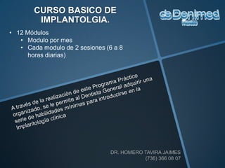 Este documento describe un curso básico de implantología dental de 12 módulos impartido por el Dr. Homero Tavira Jaimes. El objetivo del curso es enseñar a dentistas generales las habilidades mínimas para tratar pacientes con implantes dentales. El curso incluye tanto clases teóricas como prácticas con modelos y la colocación de al menos 15 implantes reales en pacientes.