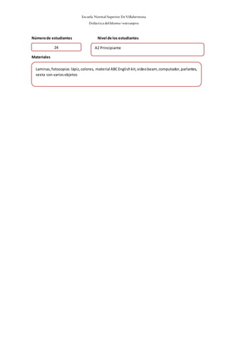 El documento presenta un plan de clase para enseñar vocabulario sobre objetos del salón de clase y la casa en inglés a estudiantes de nivel A2. El plan incluye actividades como juegos, canciones, pronunciación de vocabulario y una evaluación para practicar el vocabulario aprendido. El objetivo es que los estudiantes puedan identificar, pronunciar y escribir objetos básicos en inglés.