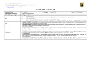 Este documento presenta el plan de clases de un profesor de inglés para un curso de 2° básico durante el mes de junio. El plan incluye 8 clases con el objetivo de reforzar vocabulario relacionado con formas, figuras geométricas y mobiliario de una casa. Las actividades involucran ejercicios orales, escritos y prácticos evaluados de manera formativa. La quinta clase consiste en una evaluación sumativa sobre los contenidos vistos.