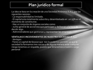 La propuesta es crear una Sociedad Anónima (S.A.) con un capital de 60101€ suscrito y desembolsado en un 25% para gestionar un negocio. Una S.A. tiene responsabilidad limitada para los socios y una estructura con una junta general de accionistas y administradores que gestionan y representan la empresa.