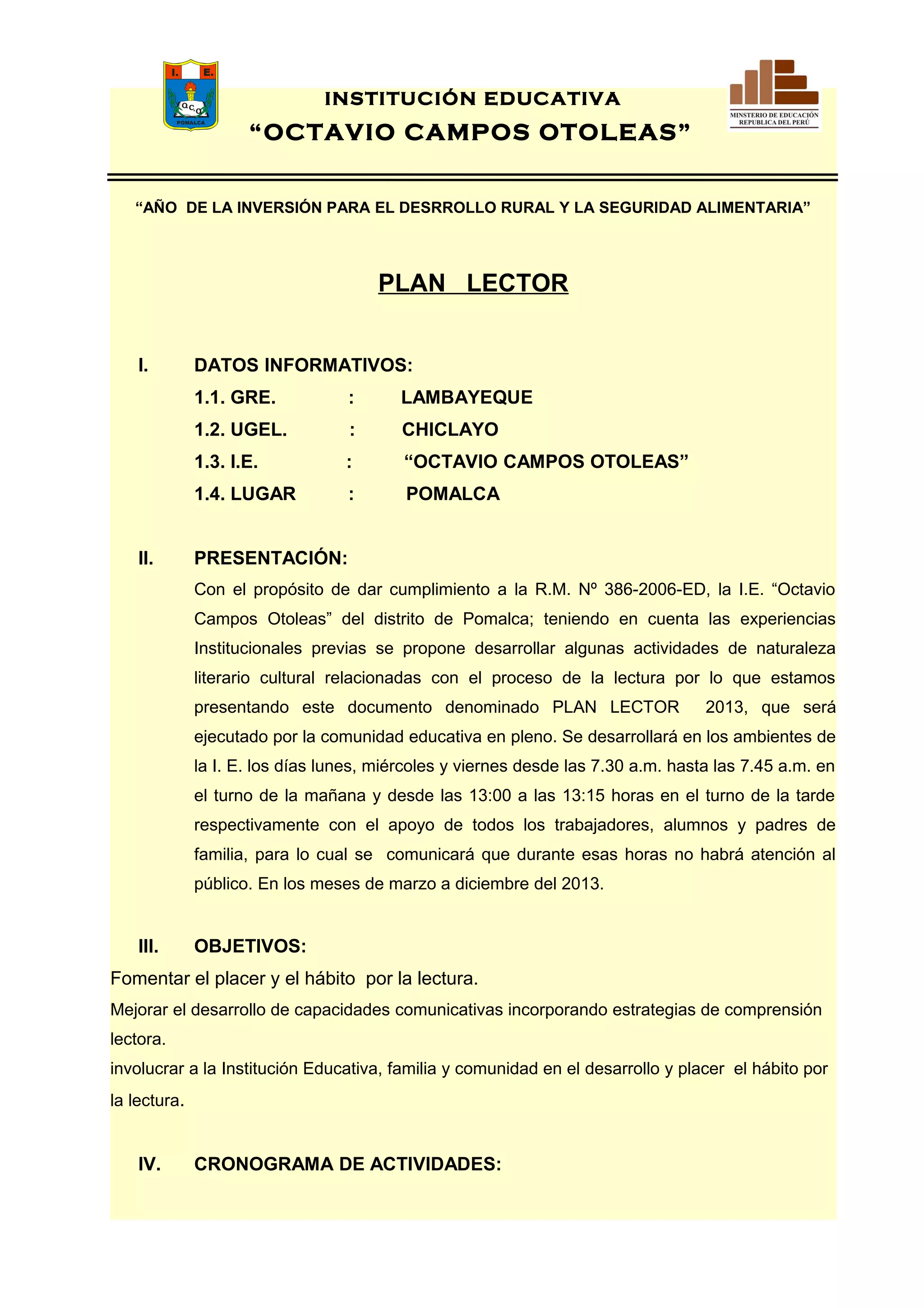 El documento presenta el Plan Lector 2013 de la Institución Educativa "Octavio Campos Otoleas" en Pomalca, Perú. El plan tiene como objetivos fomentar el placer y hábito de la lectura, mejorar las capacidades comunicativas e involucrar a la comunidad educativa en la lectura. Incluye un cronograma de lecturas mensuales para cada grado del primero al quinto año, así como actividades, responsables y cronograma para la implementación y monitoreo del plan.