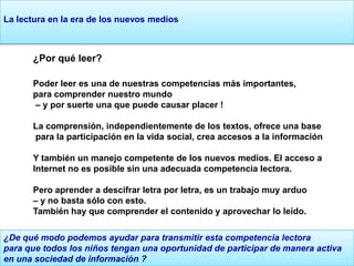 El documento trata sobre la promoción de la lectura y las competencias lectoras. Propone que la experiencia compartida de la literatura es el primer paso hacia una socialización medial exitosa y que leer con otra persona despierta el interés por las historias. También describe un proyecto de lectura en Stuttgart que crea una red para promover una cultura de lectura más amplia a través de voluntarios, bibliotecas e instituciones educativas.