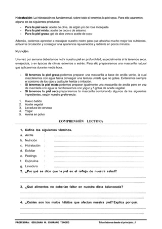 La piel es un reflejo de la salud general. Una dieta balanceada rica en frutas, verduras, cereales integrales, legumbres y semillas, así como evitar el tabaco y el alcohol, ayudan a mantener un cutis sano. Beber mucha agua, usar protector solar cuando haya exposición al sol, y realizar una limpieza, exfoliación e hidratación diaria son fundamentales para el cuidado de la piel.