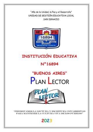 Este documento presenta el Plan Lector de la Institución Educativa N°16894 "Buenos Aires" para el año 2023. El plan tiene como objetivo principal promover la lectura y escritura en los estudiantes a través de actividades creativas que desarrollen hábitos lectores. Se detallan las metas, como lograr que el 90% de estudiantes consoliden el hábito de lectura, y el cronograma de actividades que incluye lecturas de obras literarias y el uso de herramientas virtuales. El plan busca formar lectores compet
