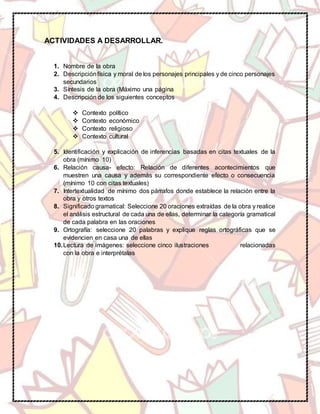 Este documento presenta el plan lector de una estudiante para el tercer período del grado 11. El plan incluye actividades como describir personajes y contextos de la obra "La Divina Comedia" de Dante Alighieri, realizar inferencias, establecer relaciones de causa y efecto, y analizar aspectos lingüísticos y ortográficos de la obra.