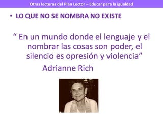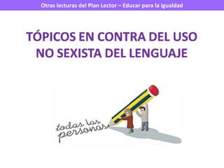El documento habla sobre el Plan Lector, Escritor e Investigador (PLEI) como un proyecto educativo para desarrollar las competencias lectoras, escritoras e investigadoras del alumnado y fomentar el hábito lector y escritor. También menciona la importancia de la coeducación y la igualdad de género en la biblioteca escolar y las lecturas recomendadas a los estudiantes.