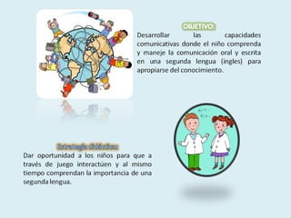 El documento describe actividades educativas utilizando programas de Microsoft Office para enseñar colores y nombres a niños. Se propone usar PowerPoint y Excel para crear juegos interactivos que refuercen el aprendizaje, aunque se anticipa resistencia de algunos padres respecto a la enseñanza de una segunda lengua. Se sugiere realizar conferencias para concientizar a los padres sobre la importancia de esta educación.