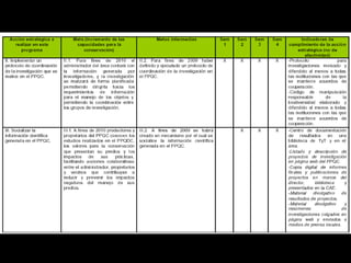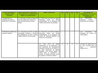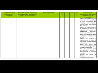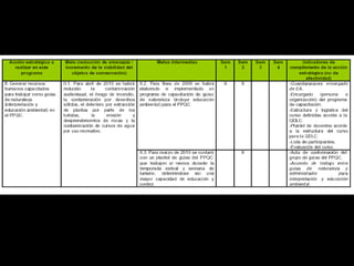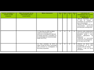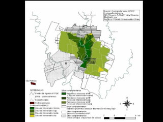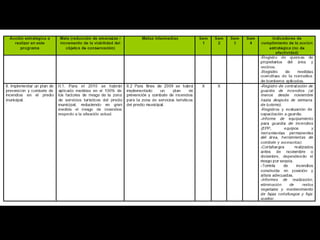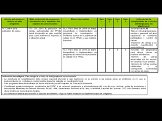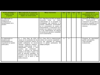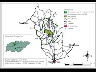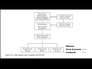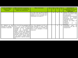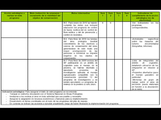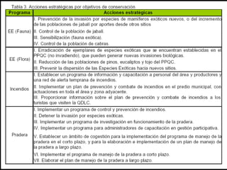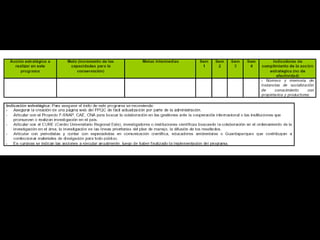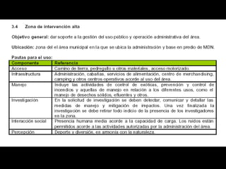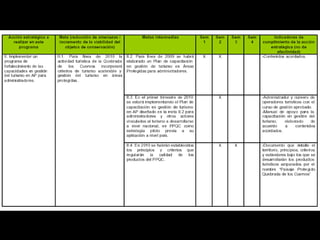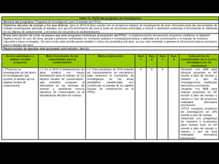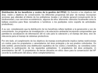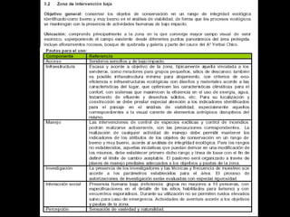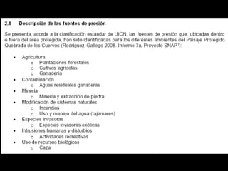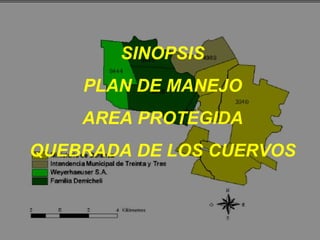 Este documento presenta el plan de manejo del Área Protegida Quebrada de los Cuervos. Se proponen modificaciones a los límites del área protegida y su zona adyacente, así como una nueva zonificación del área que incluye zonas de diferente nivel de intervención. También se describen aspectos que requieren ser oficializados para asegurar la gestión del área, como los acuerdos con propietarios y el protocolo para proyectos de investigación. Finalmente, se presentan las prioridades de investigación para el área