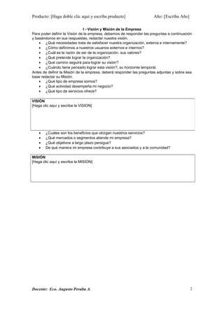 Este documento presenta un modelo de plan de marketing que incluye secciones como la visión y misión de la empresa, análisis situacional, segmentación del mercado objetivo, posicionamiento del producto/servicio y objetivos de marketing. El documento proporciona plantillas y guías para que el usuario complete cada sección con información sobre su empresa y producto.