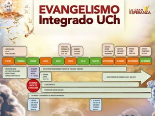 El documento describe el plan de evangelismo de la UCH, el cual se basa en tres áreas principales: comunión, misión y gerenciamiento. Incluye un cronograma anual de actividades de siembra y cosecha, con siete períodos de cosecha, así como los responsables de lanzar los diferentes períodos de siembra a nivel de campo e iglesia/colegio.