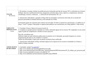 Este documento presenta una sesión de formación de 4 horas sobre el trabajo por proyectos. La sesión cubrirá las características y aplicaciones didácticas de los proyectos, los tipos de recursos TIC más adecuados y cómo incluir proyectos en el aula. Los participantes diseñarán un proyecto e incluirán recursos TIC, y publicarán conclusiones en un blog. También consultarán recursos adicionales sobre proyectos y TIC.