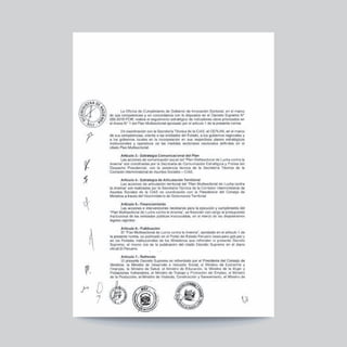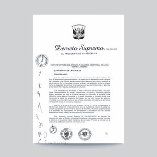 Este documento presenta el Plan Multisectorial de Lucha contra la Anemia (PMLCA), el cual fue aprobado mediante Decreto Supremo en julio de 2018. El PMLCA tiene como objetivo reducir la prevalencia de anemia en niños de 6 a 35 meses de edad en el Perú, mediante la implementación de intervenciones multisectoriales coordinadas por 15 ministerios. El plan establece metas, indicadores y responsabilidades para cada sector con el fin de mejorar la nutrición, salud e inclusión social de la niñez peruana de man