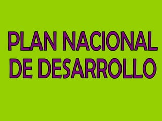 El Plan Nacional de Desarrollo es el instrumento rector de la planeación nacional en México que establece las políticas, objetivos, estrategias y lineamientos generales para orientar el desarrollo del país. Surgió en 1983 debido a la crisis económica de 1982 con alta inflación y desempleo, y fue aprobado en mayo de 1983 tras un proceso de consulta pública. Tiene como finalidad organizar democráticamente el sistema de planeación para un desarrollo nacional independiente, democrático, social y culturalmente equitativo.
