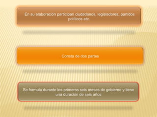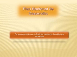 El Plan Nacional de Desarrollo es un documento elaborado durante los primeros seis meses de gobierno con una duración de seis años. Tiene como objetivo establecer las metas nacionales y es elaborado con la participación de ciudadanos y legisladores. Aborda cinco ejes rectores como Estado de Derecho, economía competitiva, igualdad de oportunidades, sustentabilidad ambiental y democracia, con el fin de impulsar el desarrollo de México.