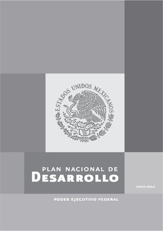 Este documento presenta el Plan Nacional de Desarrollo 2007-2012 de México. El plan establece los objetivos y estrategias que guiarán la acción del gobierno mexicano durante los próximos seis años enfocándose en cinco ejes principales: estado de derecho y seguridad, economía competitiva y generadora de empleos, igualdad de oportunidades, sustentabilidad ambiental, y democracia efectiva y política exterior responsable. El plan fue desarrollado de manera democrática e incluyente, tomando en cuenta las opiniones de diversos