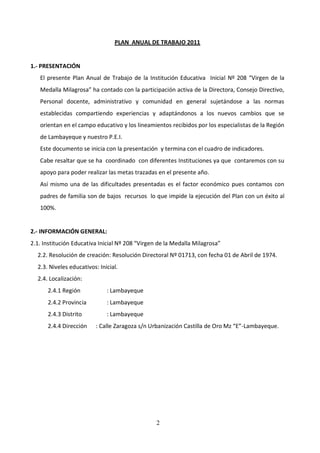 Este documento presenta el Plan Anual de Trabajo 2011 de la Institución Educativa Inicial No 208 "Virgen de la Medalla Milagrosa". Incluye información general sobre la institución, su misión y visión, un diagnóstico institucional, y metas y objetivos para el año. El plan describe los comités y consejos de la escuela, el calendario escolar, y un cuadro de áreas y actividades/proyectos para el año. El objetivo es brindar una educación de calidad a los niños de nivel inicial de acuerdo